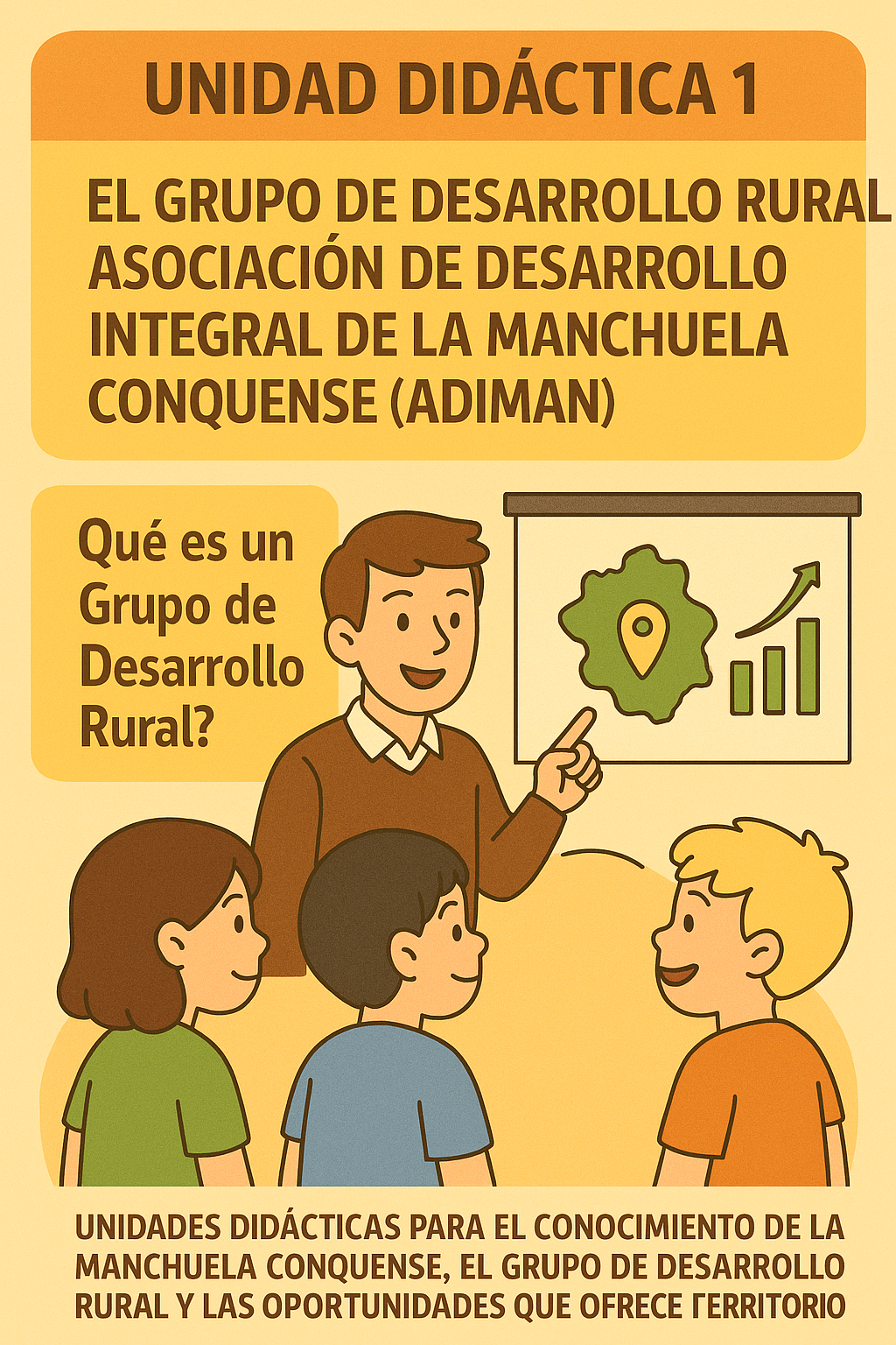 La Unidad presenta qué es un Grupo de Desarrollo Rural (GDR) y, en particular, el papel de ADIMAN en la Manchuela Conquense. Explica sus objetivos: fijar población, mejorar la calidad de vida, impulsar economía, cultura y patrimonio de la comarca. Detalla su funcionamiento: asamblea, junta directiva, equipo técnico y estrategia participativa con vecinos e instituciones. Ofrece oportunidades para jóvenes en emprendimiento y colaboración con centros educativos. Incluye propuestas didácticas, actividades prácticas y competencias clave alineadas con la LOMLOE.