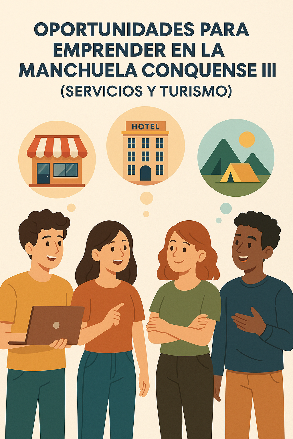 La unidad muestra el potencial del territorio en turismo rural, astroturismo, actividades de naturaleza y gastronomía, vinculados a la Reserva de la Biosfera del Cabriel. También resalta el teletrabajo, los servicios para la tercera edad y la caza y pesca como motores de empleo. Ofrece ejemplos reales de casas rurales, observatorios de estrellas, rutas micológicas y experiencias en bodegas. Subraya cómo la innovación turística puede diversificar la economía. Propone a los jóvenes diseñar proyectos que integren sostenibilidad y emprendimiento.