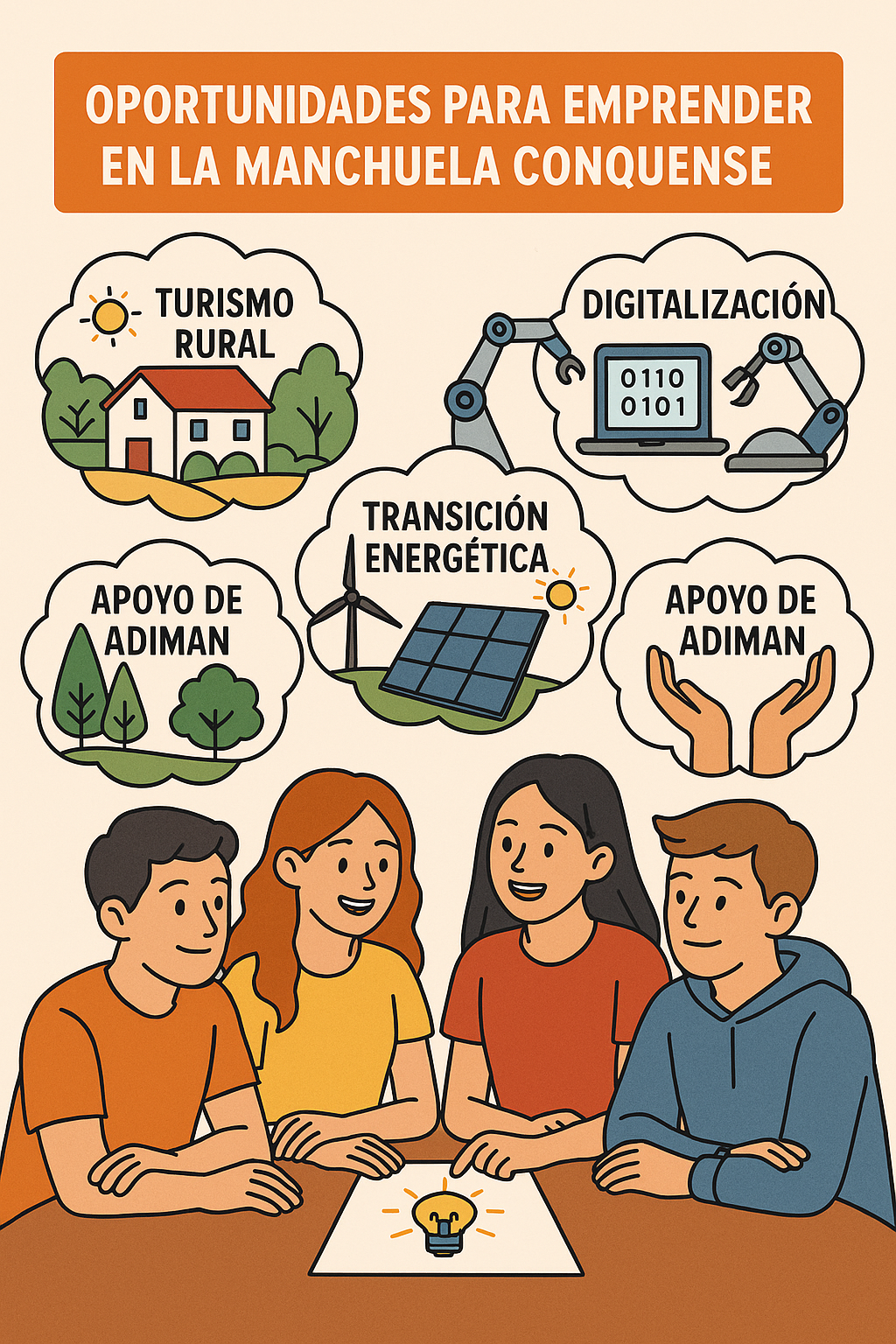 Describe las líneas de financiación y apoyo del Grupo de Desarrollo Rural para proyectos en agricultura, ganadería, industria agroalimentaria y gestión forestal. Plantea acciones estratégicas como formación, digitalización, recuperación de cultivos tradicionales, cooperativismo y fomento de la agricultura ecológica. También incluye programas de modernización de regadíos, integración en mercados y valorización de productos locales. Explica cómo se apoya la creación de nuevas empresas con criterios de sostenibilidad. Refuerza el papel de ADIMAN como aliado para emprender en la Manchuela Conquense.