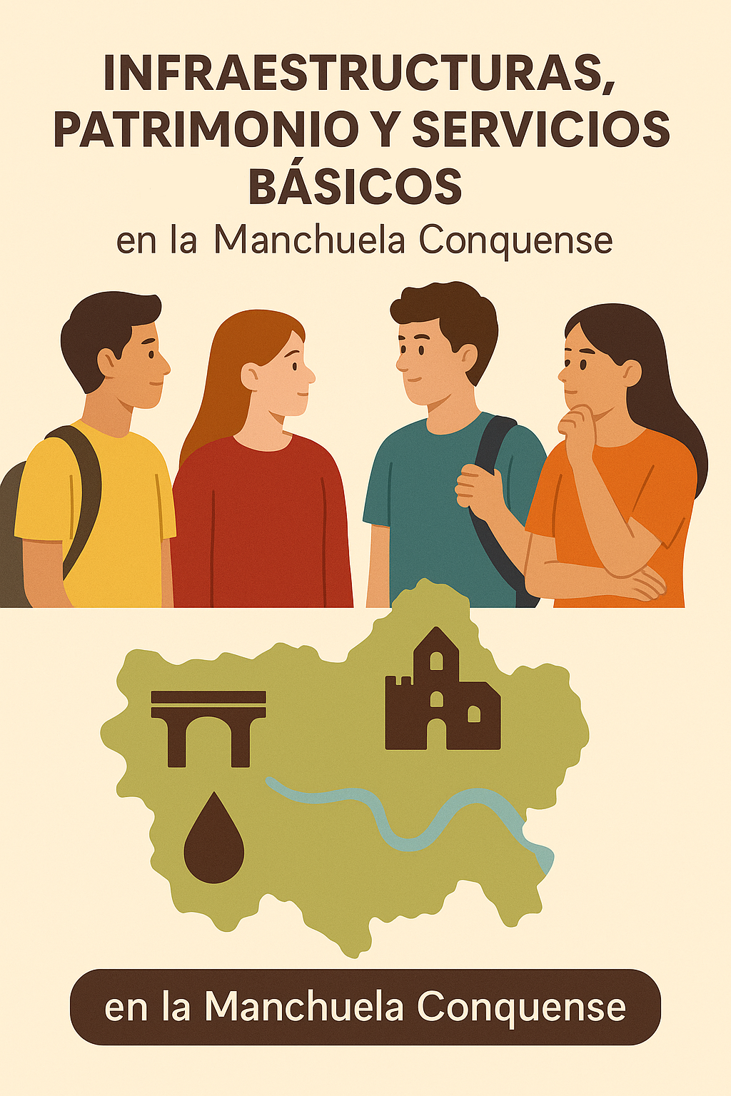 Expone la relevancia de las comunicaciones (A-3 y carreteras locales) y los polígonos industriales en el desarrollo comarcal. Resalta el valor patrimonial con 17 bienes catalogados, como Alarcón, declarado Conjunto Histórico. Describe la red de servicios básicos (educativos, sanitarios, sociales y de atención a mujeres), esenciales para fijar población. Incluye recursos para jóvenes, mayores y familias en el ámbito rural. Pone en valor el papel de estas infraestructuras para atraer inversiones y mejorar la calidad de vida.